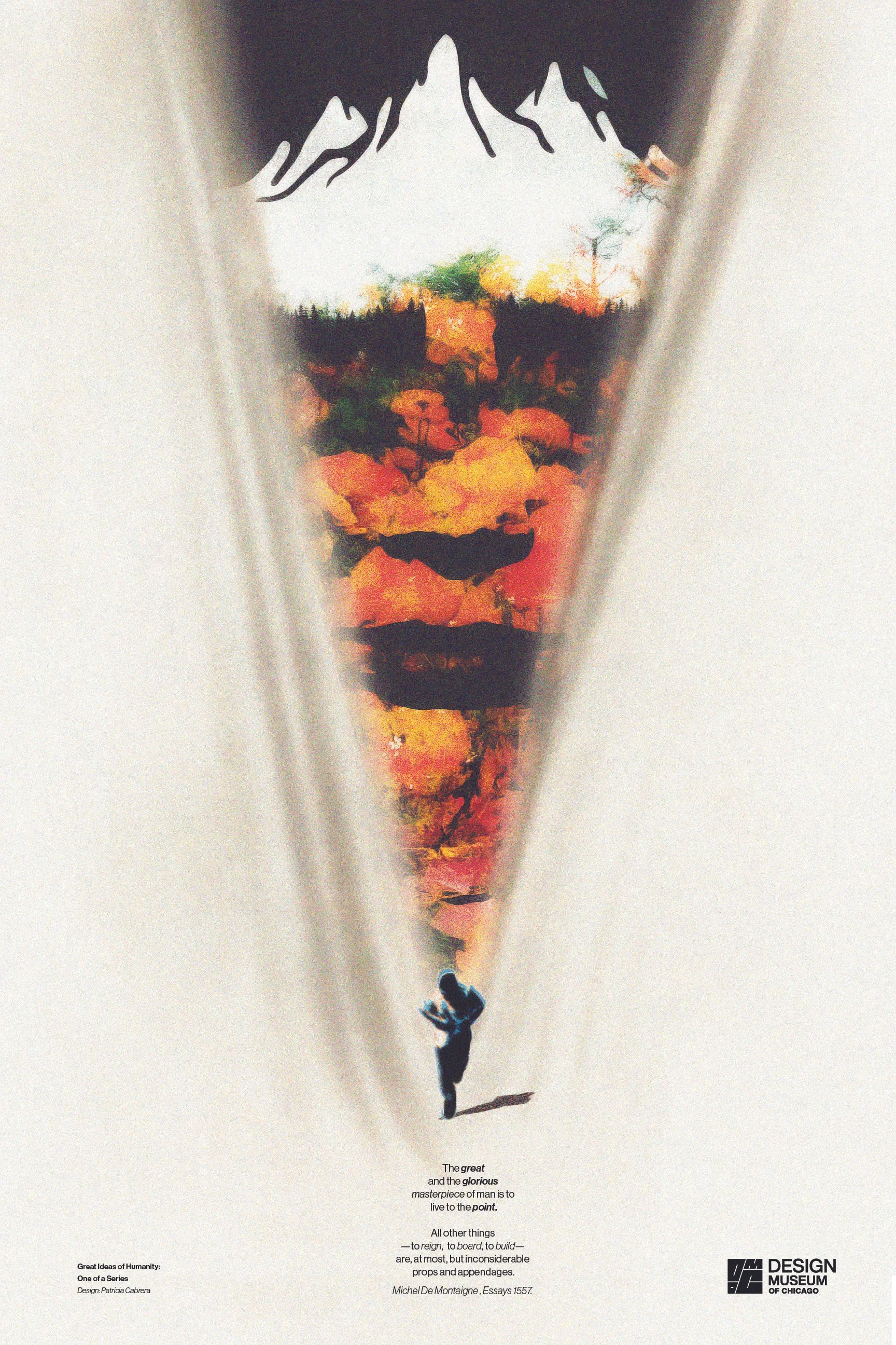 This poster was created for the Great Ideas of Humanity exhibition at the Design Museum of Chicago. It is inspired by a quote from Michel de Montaigne’s 1557 essay: “The great and the glorious masterpiece of man is to live to the point. All other things—to reign, to hoard, to build—are, at most inconsiderable props and appendages.” The poster was selected for the exhibition by a panel including the founders and directors of the traveling show, and is featured both at the Design Museum of Chicago and on the museum’s website.