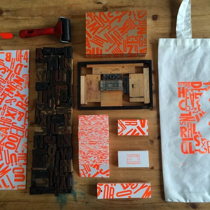 Design a set of stationery inspired by letterpress typography. You can imitate the letterpress style digitally or use actual letterpress printing, and the goal is to interpret the theme in your own style. Keep the palette mostly black and white with small pops of bright color for contrast.